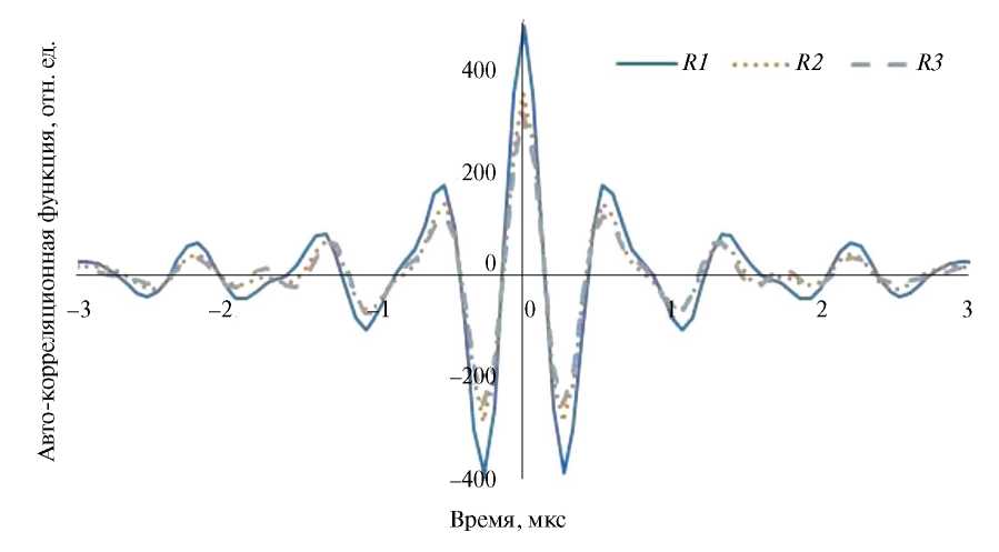 Рис. 3. Автокорреляционные функции теплового акустического излучения датчиков R1, R2, R3 (нумерацию см. на рис. 1).