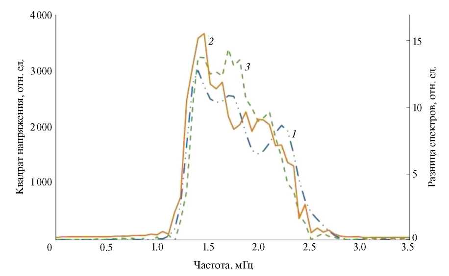 Рис. 4. Спектр, полученный из автокорреляционной функции датчика R2 (1), из кросс-корреляционной функции R1 и R2 (2); разность спектров датчика R2 с источником и без (3).