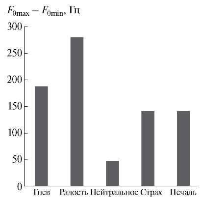 Представлены значения разности между максимальным и минимальным ЧОТ диктора-женщины № 12, в речи которой эмоции были выражены наиболее ярко (рис. 1). Минимальное значение диапазона ЧОТ характерно для нейтрального состояния – 48 Гц, максимальное для состояния радости – 279 Гц, в состоянии агрессии и страха не выявлено различий по значениям диапазона ЧОТ – 188 Гц, печаль 140 Гц.