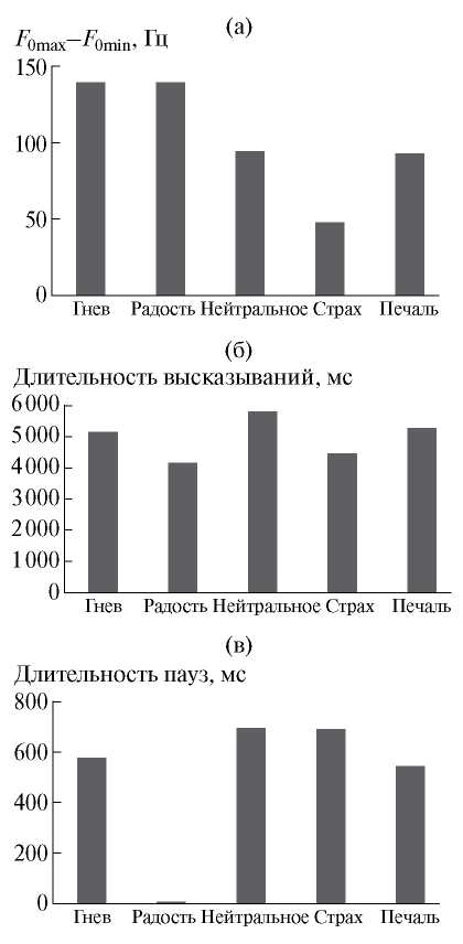 Рис. 3. (а) – Значения диапазона ЧОТ, (б) – длительности высказывания и (в) – пауз внутри высказывания диктора-женщины № 11 в разных эмоциональных состояниях.