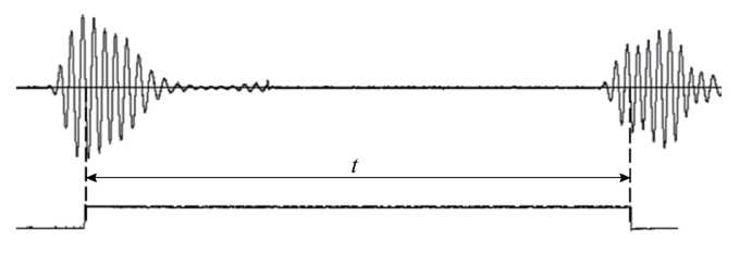 Рис. 2. Сигналы на первом и втором приемных ПЭП, импульс, формируемый измерителем по установленным стробам, и измеряемое время распространения головных волн t.