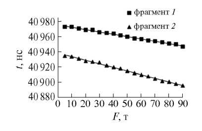 Проверка работоспособности экспериментального образца акустического тензометра выполнялась в ходе акустомеханических испытаний двух фрагментов рельсов длиной 500 мм при сжатии с помощью машины для статических испытаний ГМС-100. Фрагмент рельса с закрепленным на нем измерительным блоком устанавливался между упорными площадками машины для испытаний. Далее выставлялась сжимающая нагрузка F и проводилось измерение времени распространения головной волны t. Тесты повторялись при нагружении с шагом 5 т до максимальной нагрузки 90 т. В качестве контактной жидкости использовался УЗИ-гель. Температура в помещении составляла +25°C. Как и ожидалось, время распространения головных волн t линейно уменьшалось с увеличением приложенной сжимающей нагрузки F (рис. 3). При фиксированном положении экспериментального образца на фрагменте рельса во время акустомеханических испытаний относительная погрешность измерения времени распространения головных волн не превышала 0.0035%.