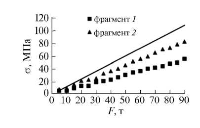 Теоретически ожидаемые значения напряжения при равномерном распределении нагрузки по сечению рельса вычислялись как F/S, где S = = 82.65 см2 – площадь поперечного сечения рельса. Однако торцы фрагментов не были идеально плоскопараллельны, и условия сжатия оказались такими, что основное пятно контакта приходилось на подошву рельса. Соответственно, нагрузка неравномерно распределялась по сечению рельса.