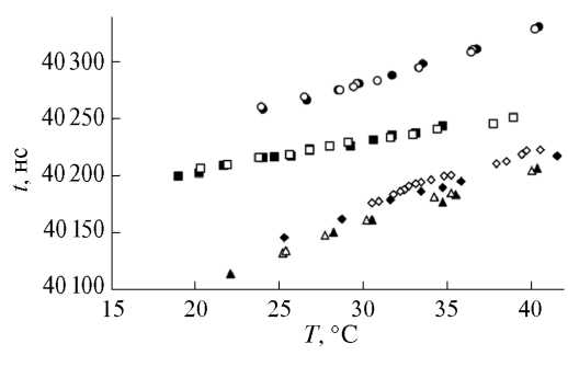 Для оценки температурных эффектов фрагмент рельса длиной 500 мм и установленный на нем измерительный блок помещались в камеру из теплоизоляционного материала и нагревались с помощью фена с цифровым управлением температурой. Температура рельса контролировалась с помощью двух термопар K типа и цифрового термометра AZ8852. Ввиду габаритов и большой массы фрагмента рельса температурное равновесие внутри камеры устанавливалось около 20 мин. В качестве контактной жидкости использовалось силиконовое масло ПМС-1000. Эксперименты повторялись несколько раз на разных фрагментах рельсов при нагреве и остывании. На рис. 5 для четырех серий испытаний закрашенными символами показаны результаты, полученные при нагреве, пустыми символами – при остывании. Полученные экспериментальные данные позволили определить температурный коэффициент kT* = (101 ± 3) × 10–6 К–1. Таким образом, изменение температуры на 1°C вызывает относительное изменение времени распространения головной волны на 0.01%, что аналогично изменению, которое вызывает продольное напряжение 8 МПа.