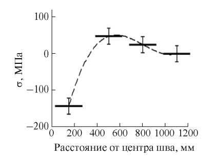 Остаточные напряжения определялись по формуле (9) при постоянной температуре. При расчете использовался коэффициент акустоупругости kσ* = 12.7 ТПа–1. Из соображений, что остаточные сварочные напряжения достаточно быстро спадают по мере удаления от шва и на расстоянии более 1 м заведомо равны нулю, в качестве начального параметра t0 использовалось значение времени распространения головных волн в крайней зоне, наиболее удаленной от сварного шва. В результате было получено распределение остаточных сварочных напряжений, действующих вдоль рельса (рис. 6). Вычисленные в результате акустических измерений значения являются средними остаточными сварочными напряжениями в слое толщиной 19 мм на базе 240 мм. Погрешность определения напряжений оценивалась по формуле (10) и составила 22 МПа.
