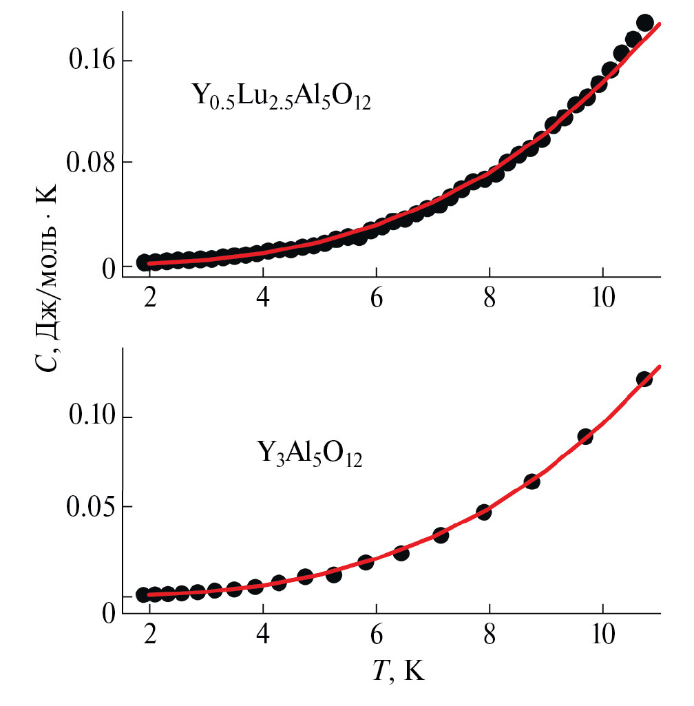 В связи с тем, что при образовании твердых растворов замещения существенно изменяется фононный спектр, целесообразно рассмотреть свойства монокристаллов Y3–xLuxAl5O12, которые могут отражать эти изменения. Одним из таких свойств является теплоемкость. Отсутствие парамагнитных ионов в решетке Y3–xLuxAl5O12 позволяет исследовать характер трансформации фононного спектра методом теплоемкости в широком диапазоне температур без учета влияния аномалий Шоттки, индуцируемых остальными редкоземельными ионами [22].