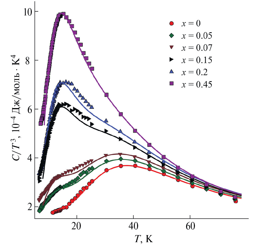 На рис. 4 представлены температурные зависимости теплоемкости Y3–хLuхAl5O12, деленной на T 3, в диапазоне от 10 до 100 K, в котором наблюдаются максимумы, обусловленные отличиями спектра колебательных состояний кристаллов гранатов от дебаевской модели. Максимумы кривых C/T 3 смещаются с ростом концентрации лютеция в сторону меньших температур и несколько уширяются для твердых растворов по сравнению с крайними составами.