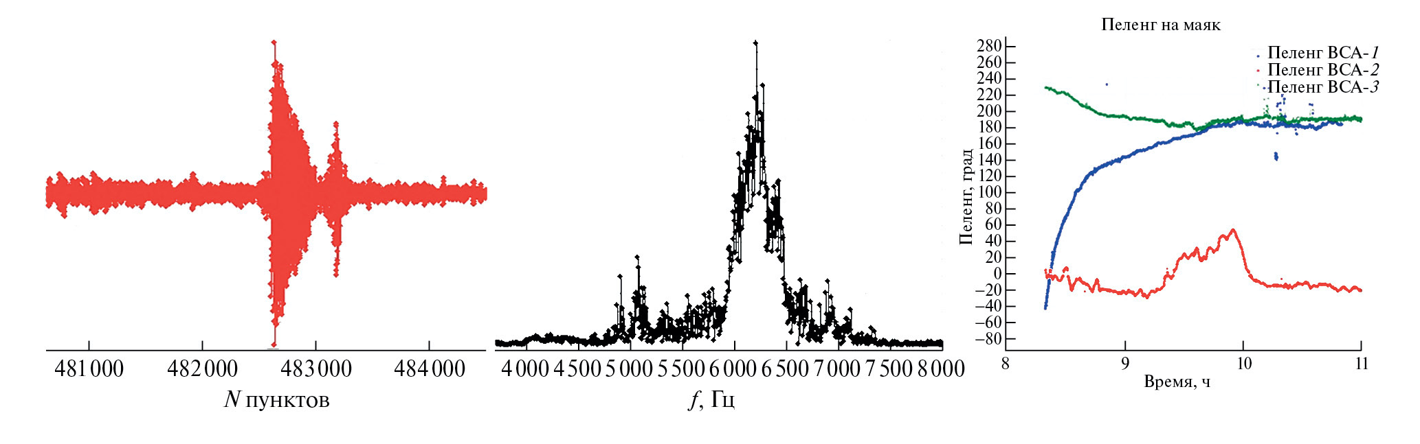 Схема морской постановки в месте проведения работ приемных антенн и стационарного излучателя импульсных сигналов (“маяка”) представлена на рис. 1в. Отметим еще раз, что сигналы “маяка” использовались как для отработки алгоритма и программного обеспечения в контролируемых условиях, так и для проверки точности оценки глубины излучателя при заданном (известном) расстоянии между излучателем и ВСА. Сигналы от “маяка” также необходимы для определения пеленгов на движущийся источник в географической системе координат (ось у направлена на север, ось х – на восток). Причина в том, что приемные модули подвешивались на фале и в процессе длительного эксперимента вращались вокруг вертикальной оси. Для устранения связанных с вращением ВСА смещений непрерывно регистрировался пеленг на стационарный излучатель “маяк”. Поэтому сигналы широкополосного излучателя “маяк” (рис. 2) включены в общую схему обработки в качестве опорных для учета при пеленговании движущегося робота.