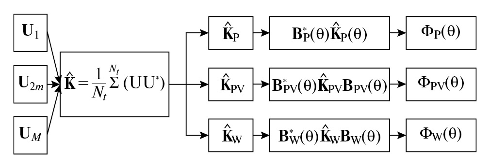 В векторно-скалярном методе обработки (методе PV) по аналогии с традиционно используемым подходом для скалярных антенн блочная матрица ковариаций для векторно-скалярной приемной антенны, состоящей из M векторно-скалярных модулей, строится в виде , где вектор U определяется соотношением (1) и имеет размерность 4M × 4M. В этом случае сканирующие вектора задаются в виде