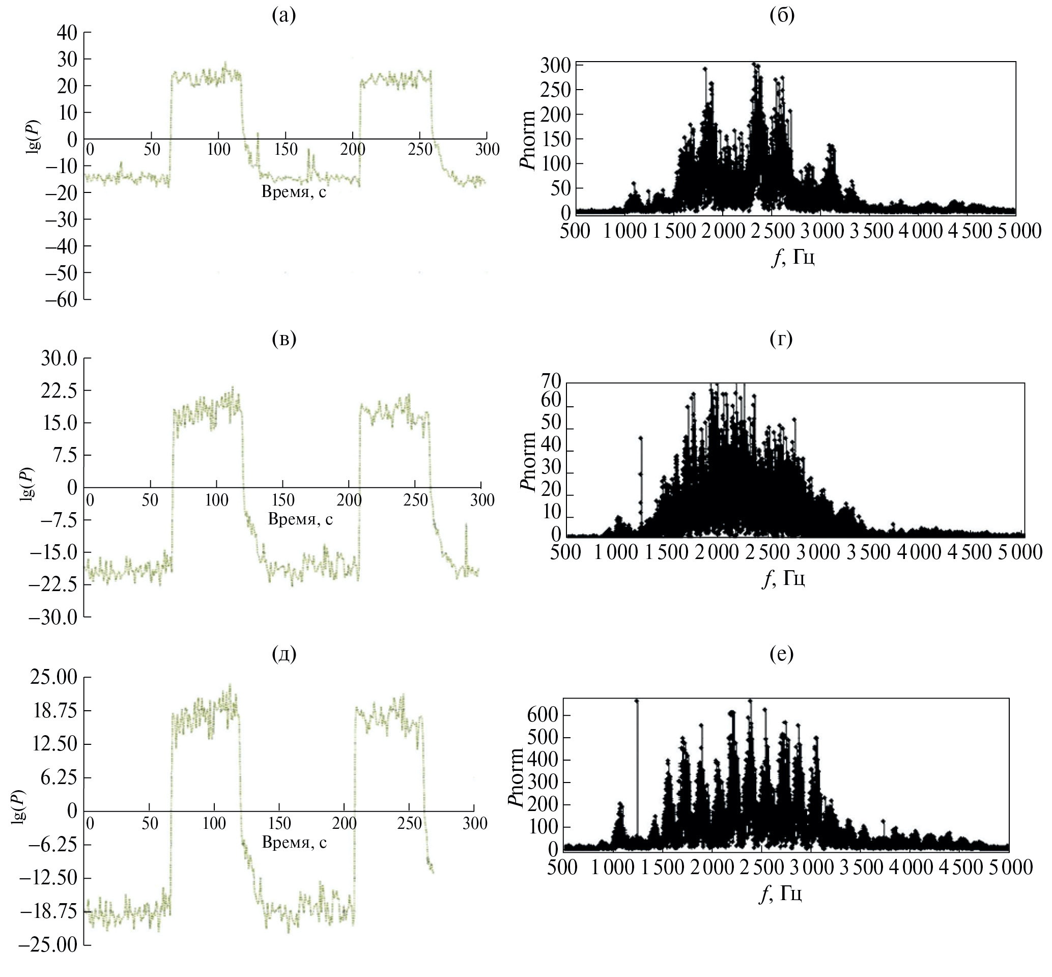 Рис. 6. Осциллограммы сигналов в полосе от 500 до 5000 Гц и их спектры на первом приемном элементе для антенн (а), (б) – ВСА-1, (в), (г) – ВСА-2 и (д), (е) – ВСА-3.