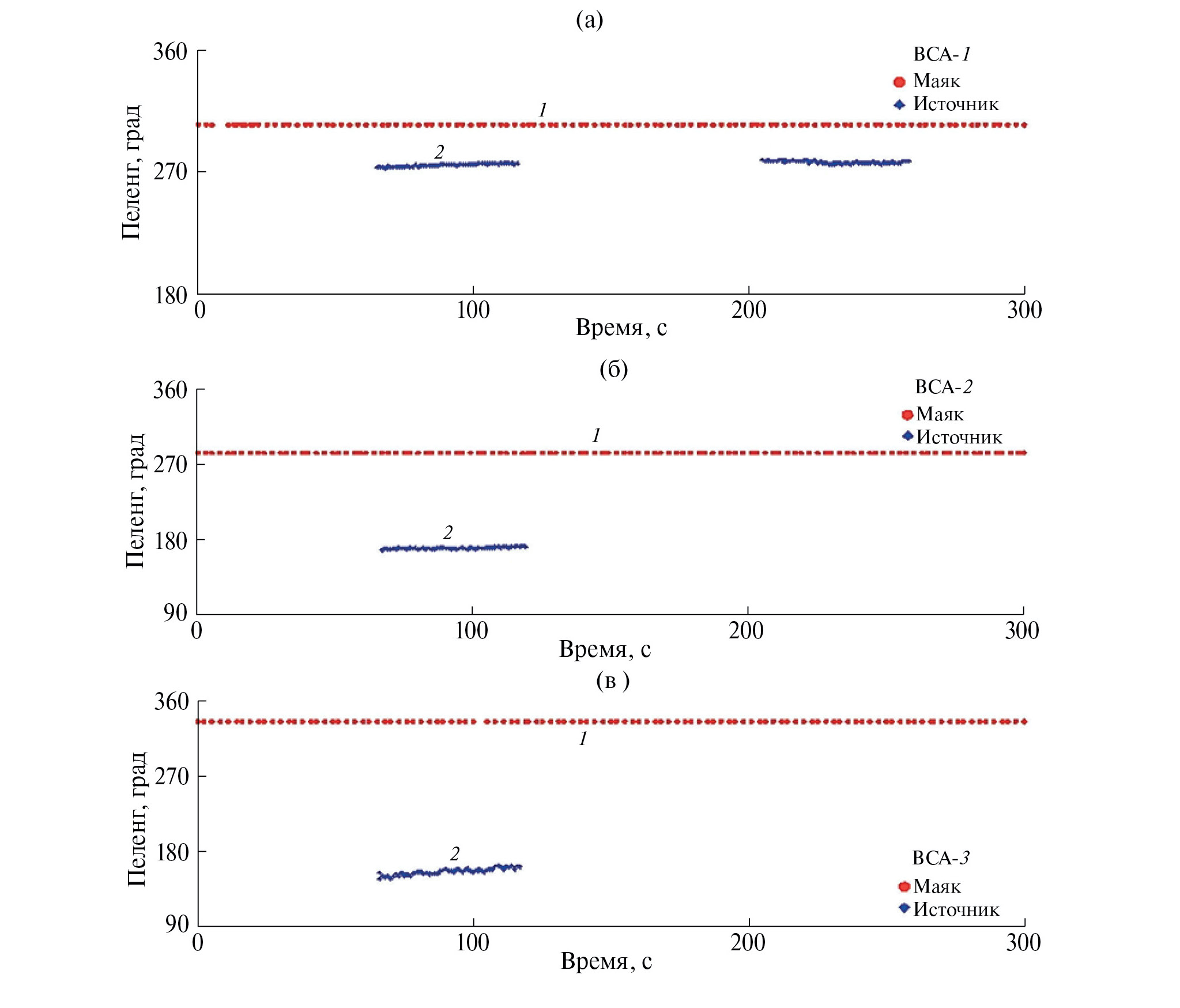 На рис. 8 и 9 заметно плавное изменение пеленга за период наблюдения, особенно это видно на рис. 8в для антенны ВСА-3, которая ближе всего расположена к движущемуся и излучающему объекту (роботу).