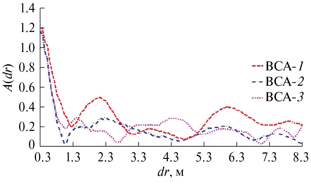 Рис. 10. Зависимости автокорреляционной функции от смещения задержек между лучами для ВСА-1, ВСА-2 и ВСА-3.