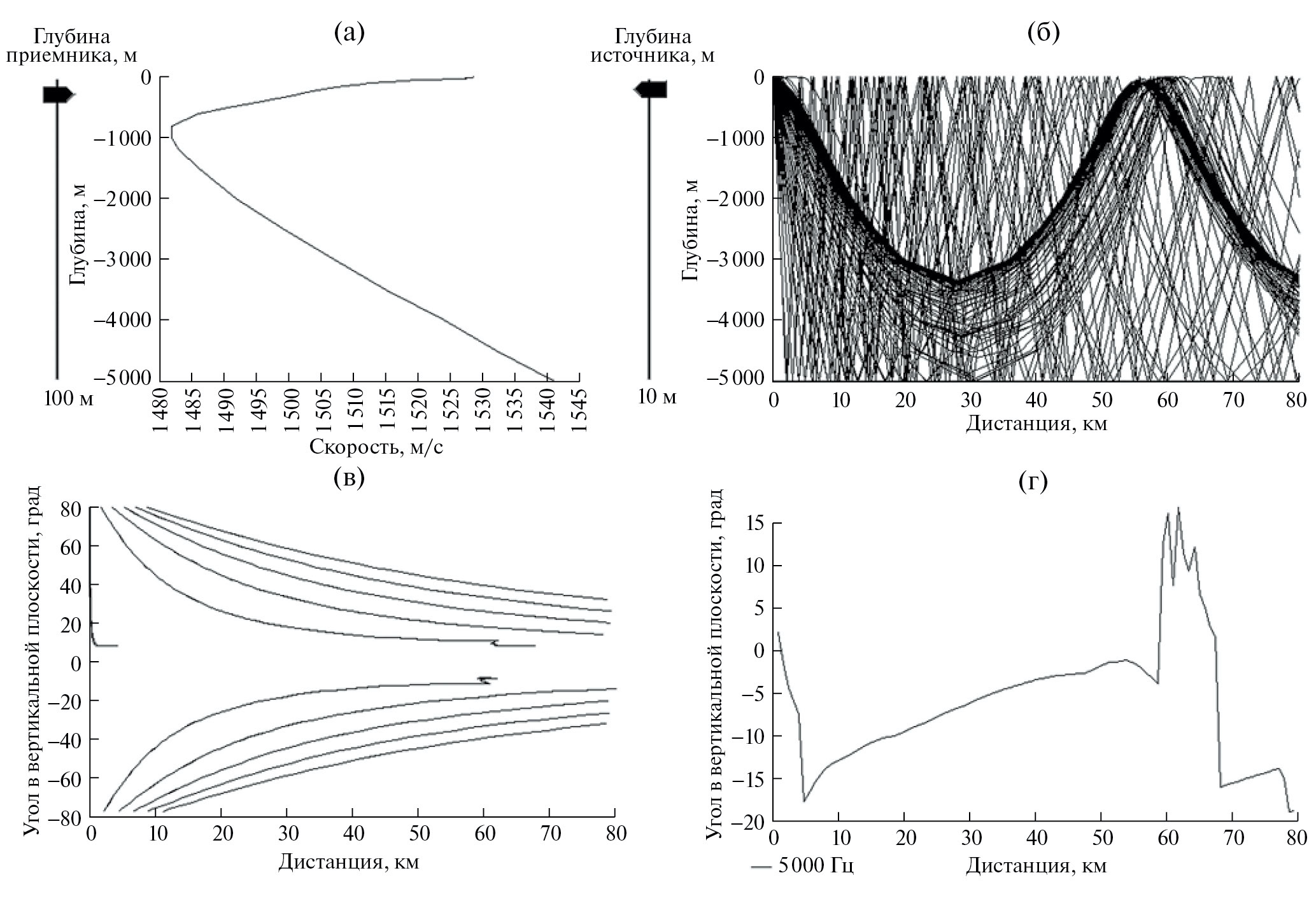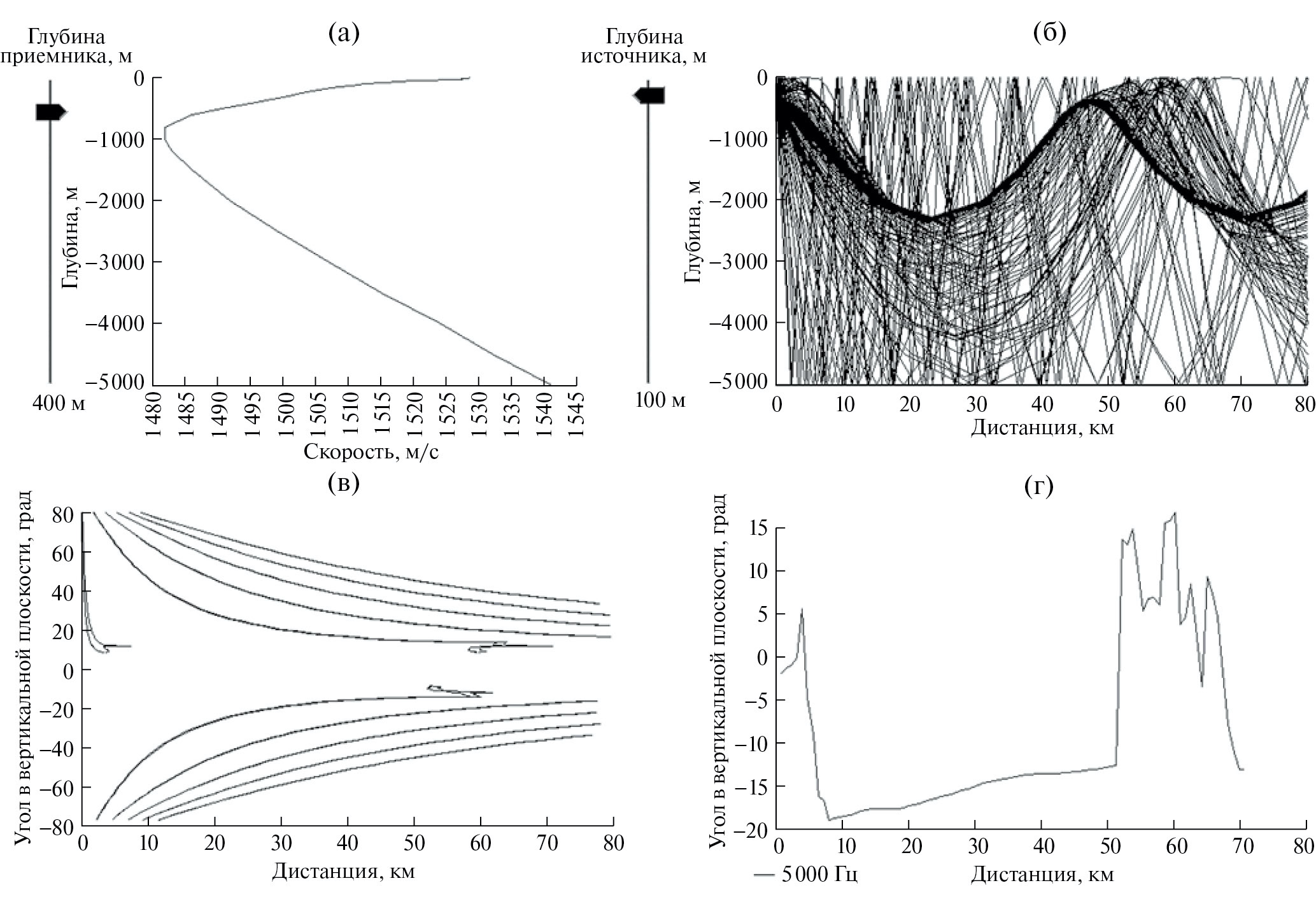 Рис. 1. Лучевая структура в условиях ДЗАО поля сигнала источника, находящегося на глубине 10 м, на входе приемника, расположенного на глубине 100 м. (а) – ВРСЗ, (б) – лучевая картина поля сигнала на входе приемника, (в) – угловая структура поля сигнала, (г) – аномалия распространения сигнала.