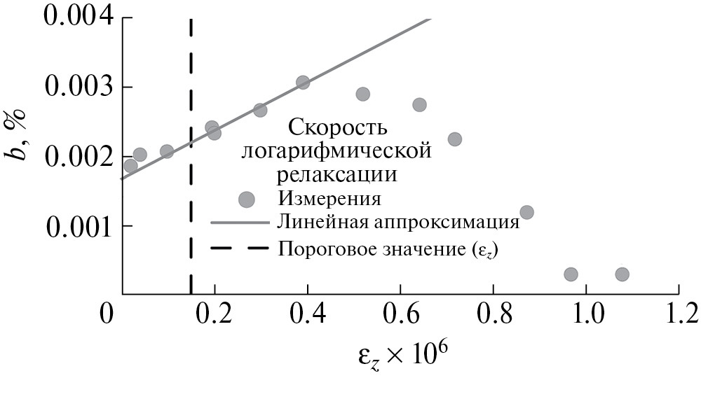 На рис. 9 представлена зависимость коэффициента b, определяющего скорость релаксации вида a + blnt, от амплитуды деформаций зондирующей волны. Для умеренных значений (кривые 1–5 на рис. 8) εz имеет место линейная зависимость b(εz), которая показана на рис. 9 сплошной линией серого цвета. Дальнейшее увеличение εz приводит к замедлению процесса релаксации: сначала возврату к характерным для малых εz значениям, а затем дальнейшему уменьшению. При εz =εp, очевидно, стадии возбуждения и релаксации неразличимы, и ожидаемая величина b = 0. Строго говоря, величина b в этом случае должна быть меньше нуля, что отвечает логарифмической зависимости от времени возбуждения (рис. 6). Эффект логарифмического по времени роста возмущения проявляется для последних трех значений εz на графике рис. 8а, когда после достижения максимума зависимости δf(t) уменьшение возмущения сменяется на его медленное нарастание.