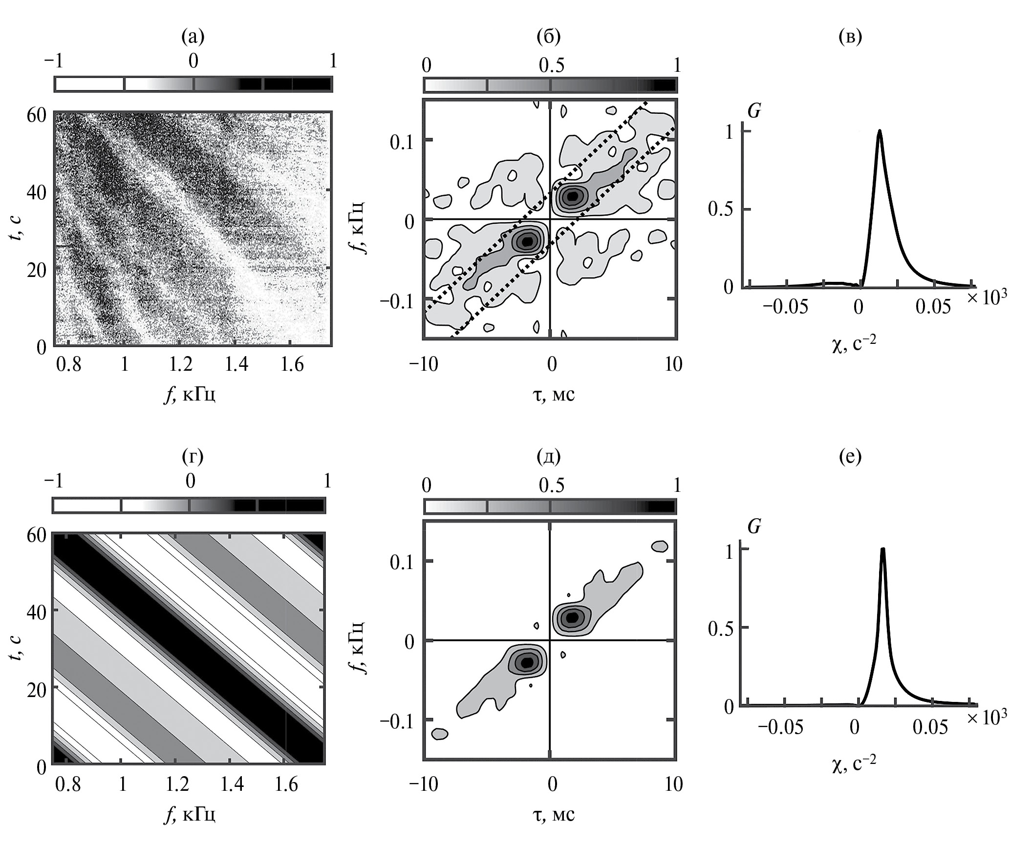 Восстановленная интерферограмма, очищенная от помехи, приведена на рис. 8г. Очищенная интерференционная картина становится контрастней, полосы имеют равные углы наклона. Максимальный частотный масштаб изменчивости оценивается как Λ = 0.96 кГц, что превышает ширину полосы Δf = 0.9 кГц.