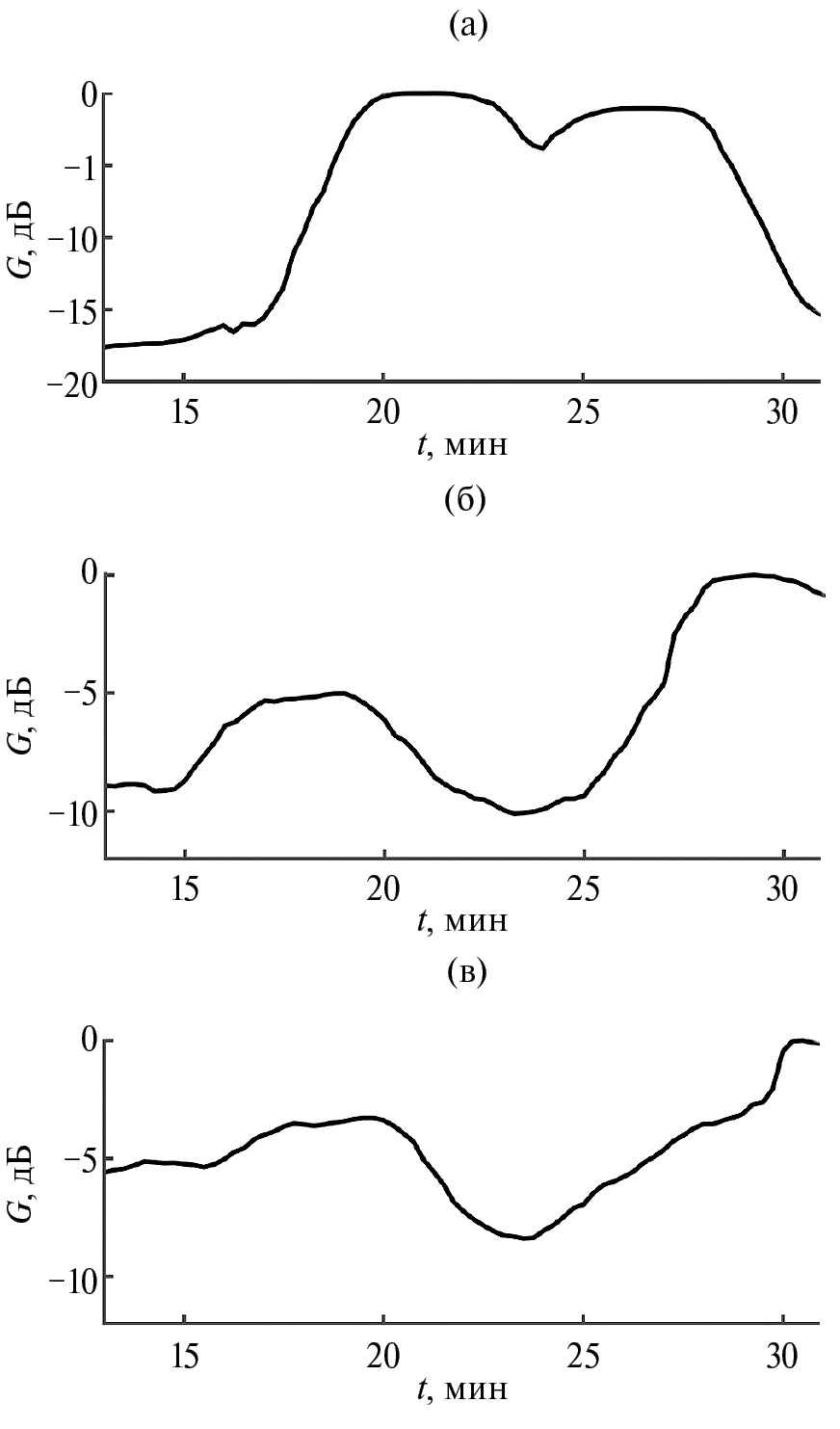 На рис. 9 приведены временные нормированные функции обнаружения G(t) по каналам звукового давления ВСП1−ВСП3. Нормировка выполнена на максимальное значение функции обнаружения во время эксперимента. Максимальные уровни спектральной плотности приходятся на области траверза. В области траверза отношение с/п на входе ВСП оценивается как: а) ВСП1 — q₀ = 9.2 дБ (прямой галс), q₀ = 8.2 дБ (обратный галс); б) ВСП2 — q₀ = -6.9 дБ (прямой галс), q₀ = - 1.9 дБ (обратный галс); в) ВСП3 — q₀ = -8.1 дБ (прямой галс), q₀ = -5.1 дБ (обратный галс). Полученные оценки входного отношения с/п в области траверза при прямом и обратном галсах указывают на анизотропность и нестационарность помехи в акватории движения подводного аппарата, вызванной интенсивным судоходством в районе проведения эксперимента.