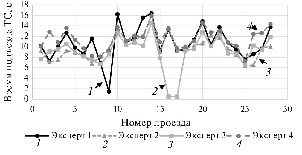 В первую очередь была проведена оценка погрешности при измерении субъективного показателя — времени подъезда. Для Tesla Model 3 без AVAS-системы при участии четырех экспертов была 27 раз произведена оценка времени подъезда при скорости движения ТС 40 км/ч, результаты показаны на рис. 3. По этим данным было рассчитано стандартное отклонение для каждого эксперта (табл. 2). Усредненное для всех экспертов стандартное отклонение времени подъезда составило 2.6 с.