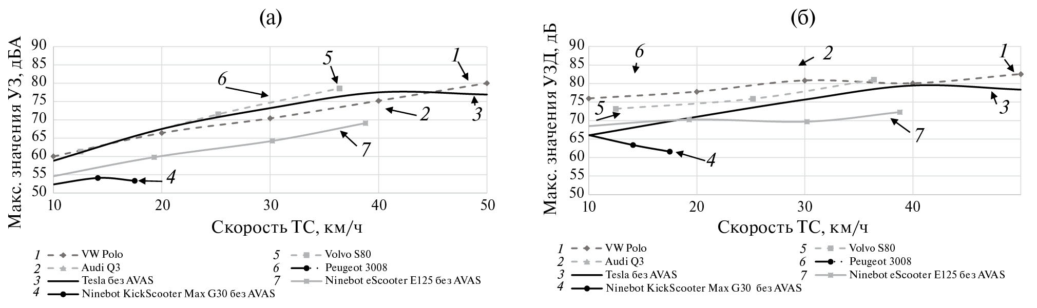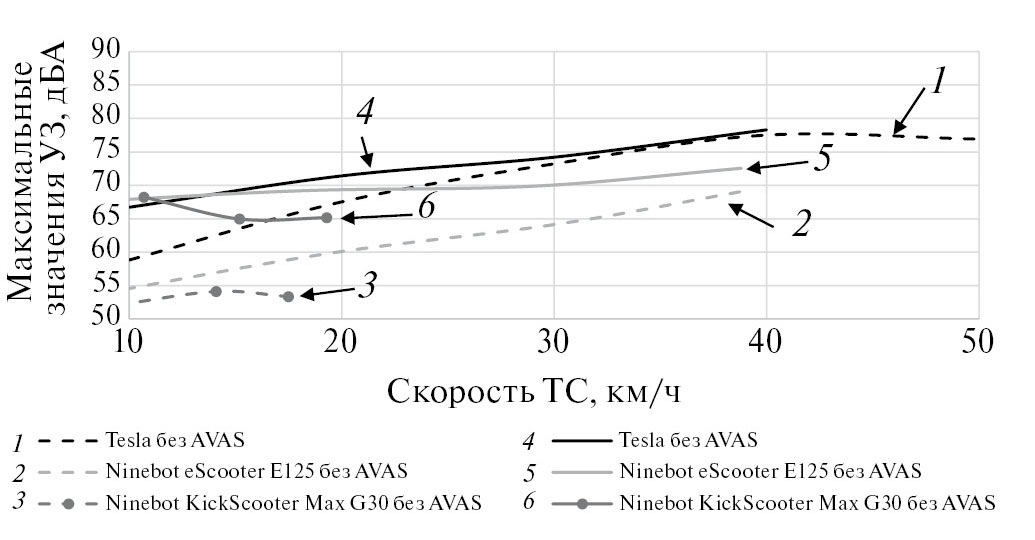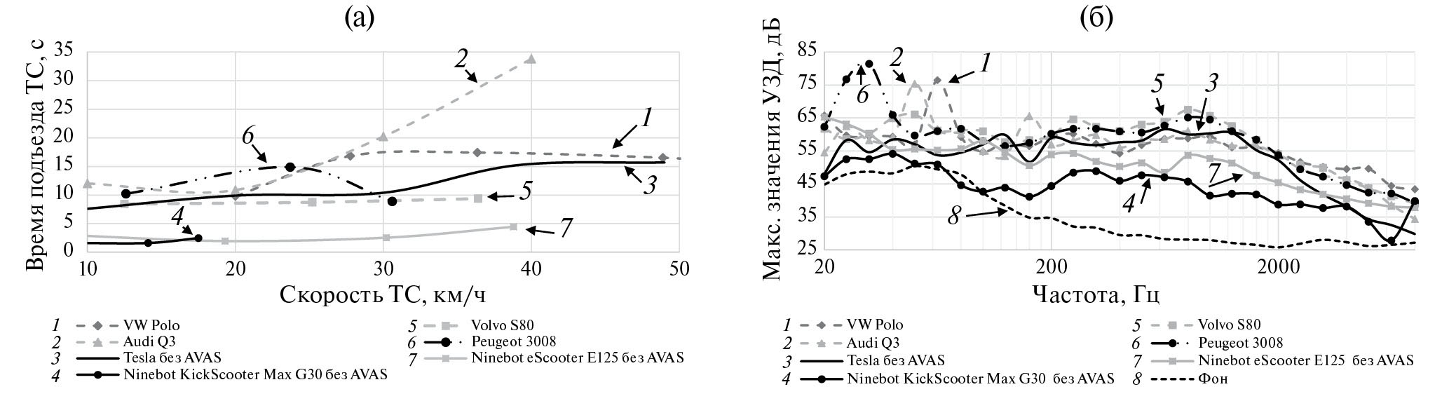 На рис. 4 показаны медианные значения результатов оценки всеми экспертами времени и расстояния подъезда для транспортных средств без включенной AVAS-системы. Пунктиром обозначены ТС с электродвигателями, сплошной линией — с ДВС. Из графиков видно, во-первых, что автомобили с ДВС более заметны, чем электромобиль Tesla Model 3 (за исключением Volvo S80, который с ним сопоставим), во-вторых, что мопед и самокат обладают очень низкой заметностью.