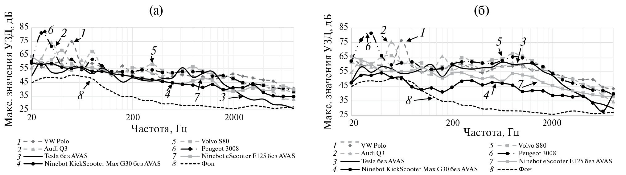Рис. 6. Результаты измерений по методике [2] частотных характеристик максимальных значений уровня звукового давления в 1/3 октавных полосах для скоростей (а) — 10 и (б) — 20 км/ч