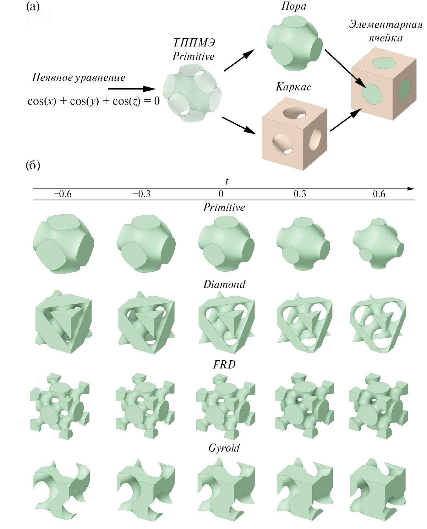 Рис. 1. (а) — Процесс моделирования элементарной ячейки ТППМЭ с геометрией Primitive; (б) — 3D модели пор с разной геометрией ТППМЭ и параметром t