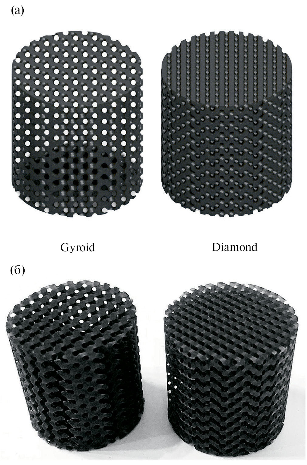 Для экспериментального исследования нормального коэффициента звукопоглощения α в программной среде MSLattice [31] были смоделированы 2 типа образцов с геометрией Gyroid и Diamond, диаметром 29 мм и высотой 30 мм с размером элементарной ячейки 3 мм и заполнением пространства 50%, что соответствует случаю t = 0. Для точного воспроизведения геометрии моделей была выбрана LCD (liquid crystal display) технология 3D печати с использованием принтера Anycubic Photon M3 Max и фотополимерной смолы марки «Anycubic 3D Printing UV Sensitive Resin Black». В процессе 3D печати УФ-излучение ЖК-матрицы направлено на резервуар с фотополимером. В зависимости от геометрии образца, излучают только пиксели, соответствующие сечению модели для создания текущего слоя. По мере послойной полимеризации смолы формируется образец, соответствующий своей цифровой модели. Условия печати: толщина одного слоя — 50 мкм, время засветки — 3 с.