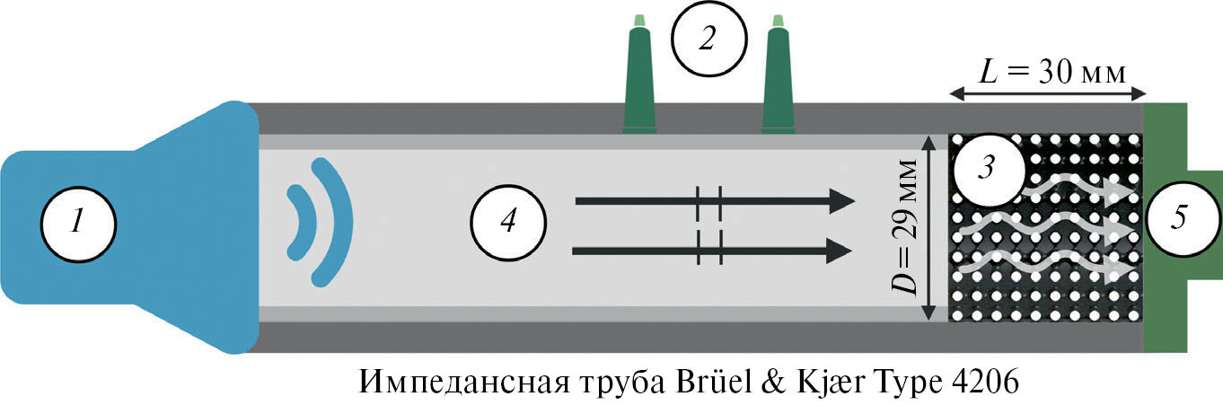 Нормальный коэффициент звукопоглощения α определялся по методике ISO 10534–2:1998 «Определение коэффициента звукопоглощения и импеданса в импедансных трубках» [32] на изготовленных образцах в частотном диапазоне от 500 до 6400 Гц на основе усреднения трех результатов измерений. В качестве испытательного оборудования использовали акустическую трубу типа 4206 производства “Brüel & Kjær” (Дания). Обработка данных проводилась в программном продукте LabShop Version 18.1.1.13. На рис. 3 представлена схема импедансной трубы для измерения нормального коэффициента звукопоглощения методом двухмикрофонной передаточной функции.