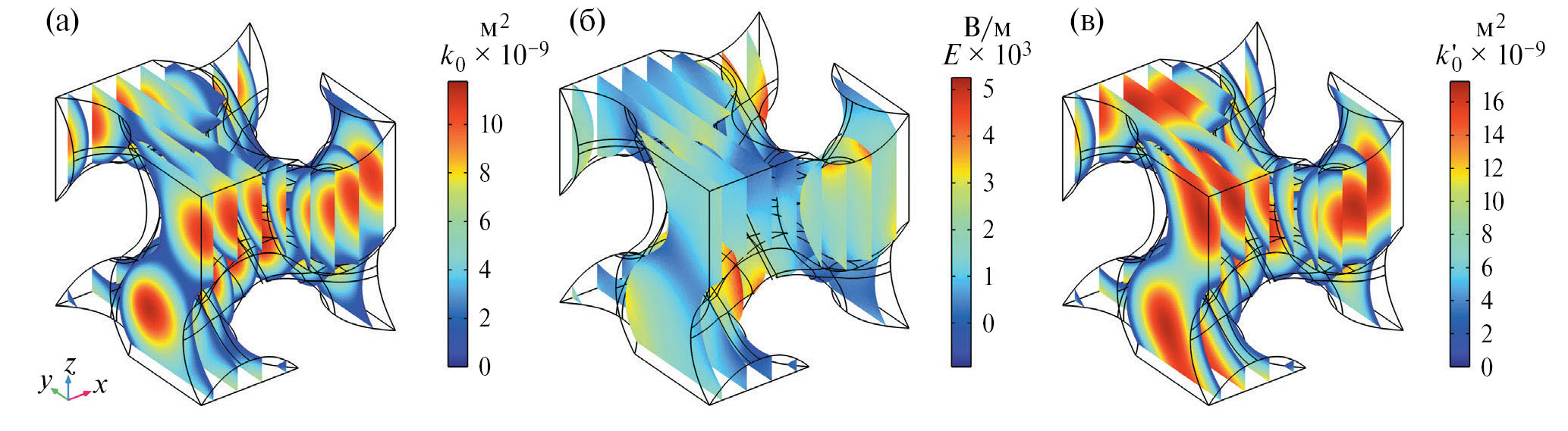 Рис. 4. (а) — Контуры поля статической проницаемости, (б) — контуры поля напряженности и (в) — контуры теплового поля внутри поры с геометрией Gyroid