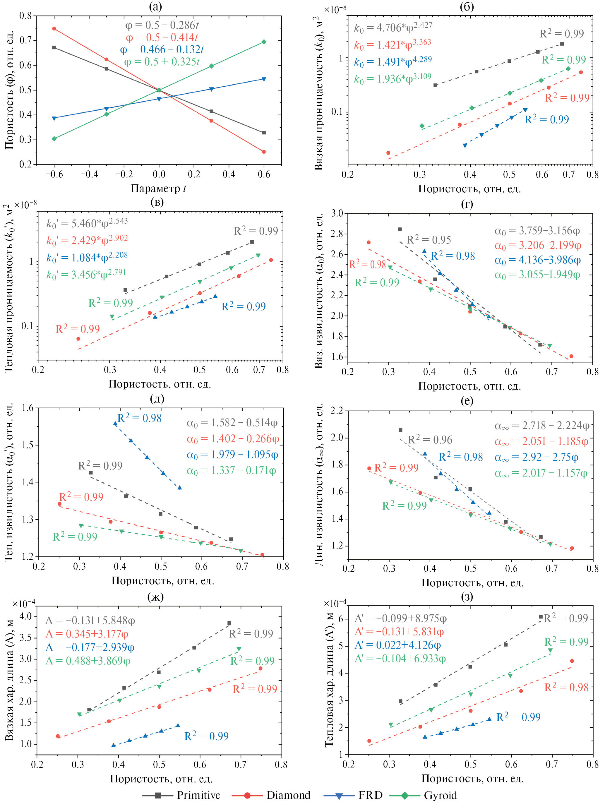 Получаемые из тригонометрических функций топологии имеют различные значения пористости (рис. 5а), которые линейно изменяются с изменением структурного параметра t в уравнениях (1)–(4). Геометрии типа Primitive, Diamond и Gyroid являются балансными, т.е. при t = 0 имеют пористость 0.5. Геометрия типа FRD является небалансной и имеет пористость 0.44 при t = 0. Статическая вязкая и тепловая проницаемость во всех структурах увеличивается с увеличением пористости (рис. 5б, 5в) и хорошо интерполируются степенными функциями. Было обнаружено, что геометрия FRD обладает более низкими значениями проницаемости, что связано с наличием узких воздушных каналов в структуре. Напротив, геометрия Primitive обладает высокой пропускной способностью, что объясняется простой полой структурой. Для определения закономерности изменения извилистости структуры от ее пористости может быть использована как линейная, так и степенная интерполяция значений. Была выбрана линейная интерполяция, поскольку во многих случаях она показала наименьшую дисперсию значений (R2 приблизительно равен 1). Вязкая, тепловая и динамическая извилистость предсказуемо уменьшаются с увеличением пористости (рис. 5г-5е). Стоит отметить, что для геометрий типа Diamond и Gyroid диапазон значений практически одинаковый, что связано с сохранением сечения пор. У геометрий Primitive и FRD сечение поры сильно меняется по толщине элементарной ячейки, что отражается в высоких значениях извилистости при малой пористости. Для вязкой и тепловой характеристических длин были также определены линейные зависимости от пористости (рис. 5ж, 5з) для всех геометрий.