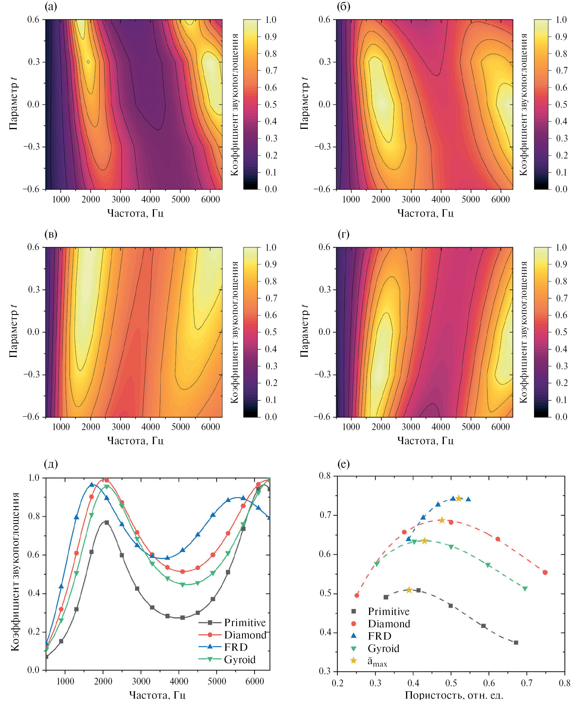 Рис. 6. Контурный график коэффициента звукопоглощения в зависимости от частоты и параметра t для структур ТППМЭ с геометрией (а) — Primitive, (б) — Diamond, (в) — FRD, (г) — Gyroid, (д) — характер звукопоглощения исследуемых геометрий при t = 0; (е) — зависимость среднего коэффициента звукопоглощения от пористости структуры ТППМЭ