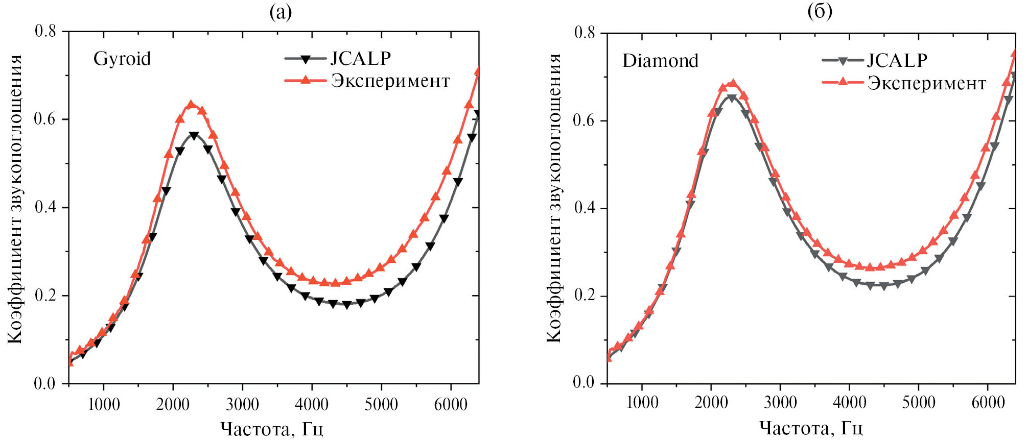 Для сравнения численного и экспериментально полученного коэффициента звукопоглощения образцов акустические параметры, рассчитанные в разделе 3.1.1, были масштабированы в соответствии с размером элементарной ячейки 3 мм. В табл. 1 представлены восемь параметров модели JCALP, полученные для каждой модели. На рис. 8 показана зависимость расчетного и измеренного коэффициента звукопоглощения от частоты звуковой волны. Установлено, что результаты, полученные с использованием модели JCALP, адекватно согласуются с экспериментальными данными для всех образцов. Наибольшее отклонение на частоте максимального поглощения (амплитуды) наблюдается у образца Gyroid и соответствует –12%, отклонение образца Diamond составляет –5%.
