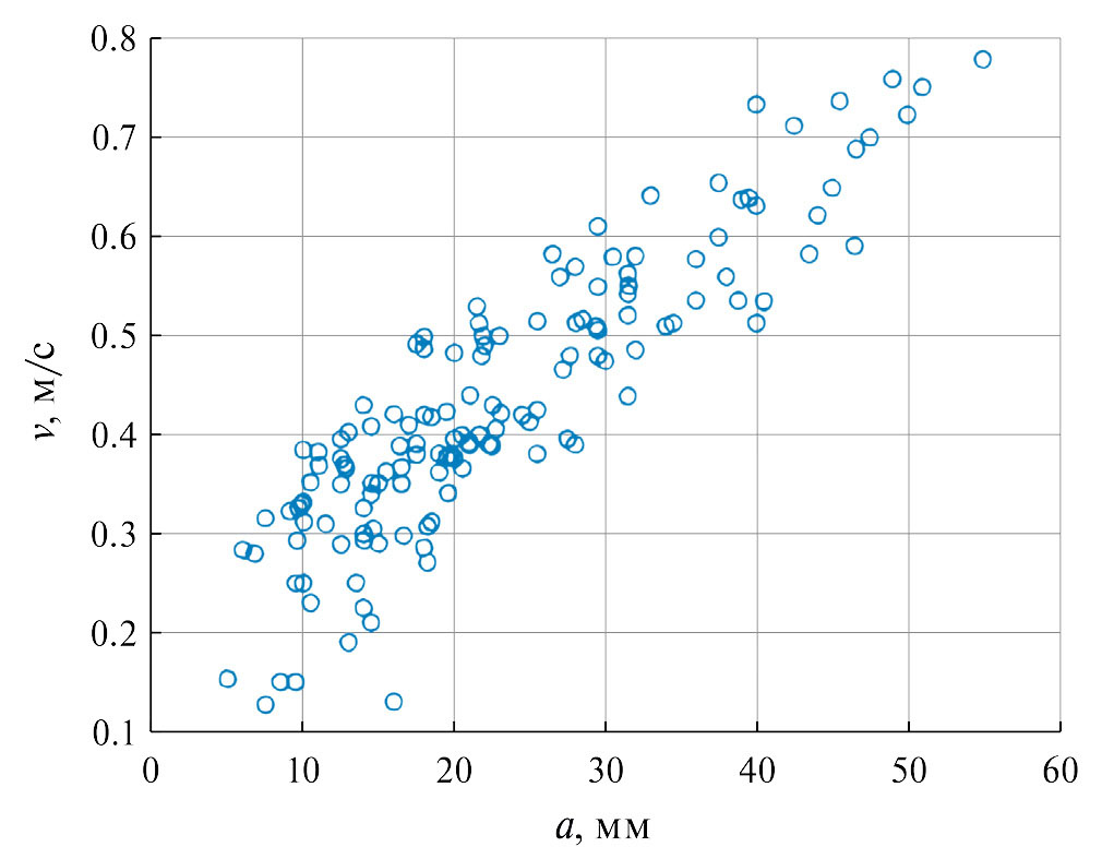 Зависимость вертикальной скорости пузырьков от радиуса для данной выборки приведена на рис. 5. Каждое значение на графике соответствует отдельному, отслеженному по кадрам пузырьку. Вертикальные скорости пузырьков, полученные с помощью стереосъемки, согласуются с данными, полученными ADCP: основная масса сосредоточена в диапазоне 0.3–0.4 м/с, пиковое значение составляет порядка 0.7 м/с.