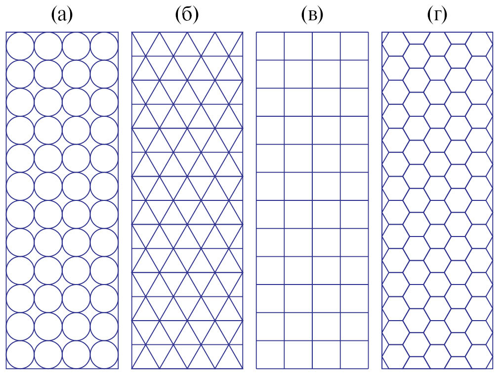 Для нахождения коэффициентов Am на основе выражения (2) должны быть известны собственные функции ψ, однако их представление в аналитическом виде не всегда возможно, т.к. в общем случае рассматриваемое поперечное сечение может иметь сложную форму. Например, для натурных звукопоглощающих облицовок волноводов резонаторы цилиндрической формы применяются редко, т.к. они не эффективно используют свободный объем, отводимый на заполнение всей конструкции (между стенками резонаторов имеются неиспользуемые пустоты). Причем, если для акустических облицовок, применяемых в наземных агрегатах, компенсировать потери в поглощении звуковой энергии из-за неиспользуемых объемов можно путем увеличения габаритов ЗПК, то для летательных аппаратов, где весовые характеристики играют важную роль, такое решение является неприемлемым. В результате, для эффективного использования объема всей конструкции обычно применяются резонаторы, форма которых обеспечивает отсутствие пустот между стенками соседних ячеек. Примеры некоторых форм резонаторов представлены на рис. 1.