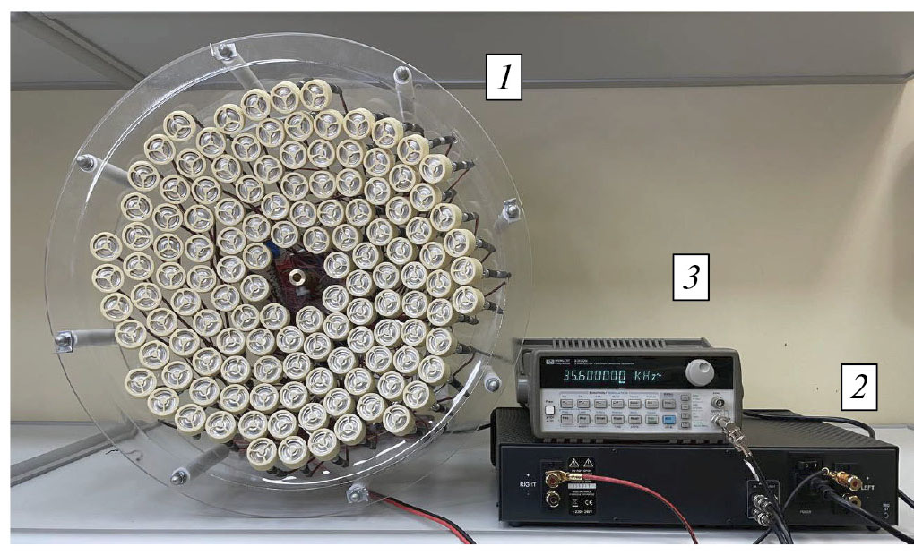 Фотография изготовленной решетки 1 и сопутствующего оборудования, необходимого для ее функционирования (усилитель 2 и генератор 3), представлена на рис. 1. Элементы решетки были установлены в прозрачной акриловой сферической чаше (Мастерская «Акрилайс», Москва, Россия) диаметром 500 мм и радиусом кривизны 500 мм. Элементами фокусирующей решетки служили 128 пьезоэлектрических преобразователей УП-3-01 (ООО «Аэрофон», Волгоград, Россия) с центральной частотой излучения 35.5 кГц и диаметром 30 мм [19]. Длина акустической волны в воздухе на центральной частоте составляет 9.7 мм. С целью подавления паразитных дифракционных максимумов индивидуальные преобразователи были расположены вдоль восьми плотных спиралей, предложенных ранее при конструировании HIFU-решеток для терапевтических применений мегагерцового ультразвука [20, 21]. Крепление преобразователей на сферической чаше осуществлялось с помощью специальных держателей в виде трубок с внешней резьбой, вкрученных в посадочные резьбовые отверстия на акриловой чаше. Внутри трубок были расположены электрические провода, питающие пьезоэлементы. Резьба держателей позволяла путем их вкручивания или выкручивания регулировать положение элементов относительно сферической чаши в пределах 40 мм с точностью позиционирования около 0.1 мм. На основании каждого держателя, находящегося с противоположной (выпуклой) стороны акриловой чаши, был установлен аудио-разъем TS с гнездовым контактом диаметром 3.5 мм, который позволял подключать элемент к источнику электрического напряжения. Все элементы решетки были электрически связаны с использованием параллельного соединения. Для этого идущий от источника электрической мощности двухжильный кабель разветвлялся на 128 кабелей длиной 500 мм, которые подключались к пьезоэлементам посредством TS разъемов со штыревым контактом диаметром 3.5 мм. Решетка, тем самым, представляла собой совокупную электрическую нагрузку для источника мощности.