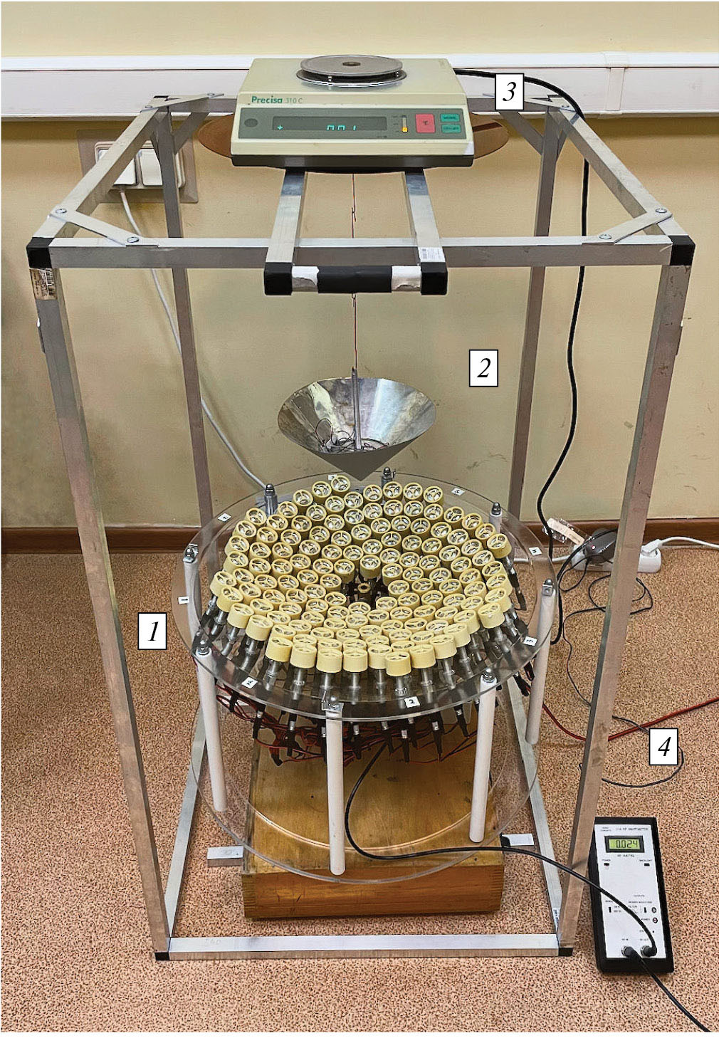 Рис. 4. Фотография экспериментальной установки для измерения электроакустической эффективности УЗ решетки на основе измерения акустической радиационной силы. 1 – УЗ-решетка, 2 – конический отражатель, 3 – прецизионные весы, 4 – ваттметр