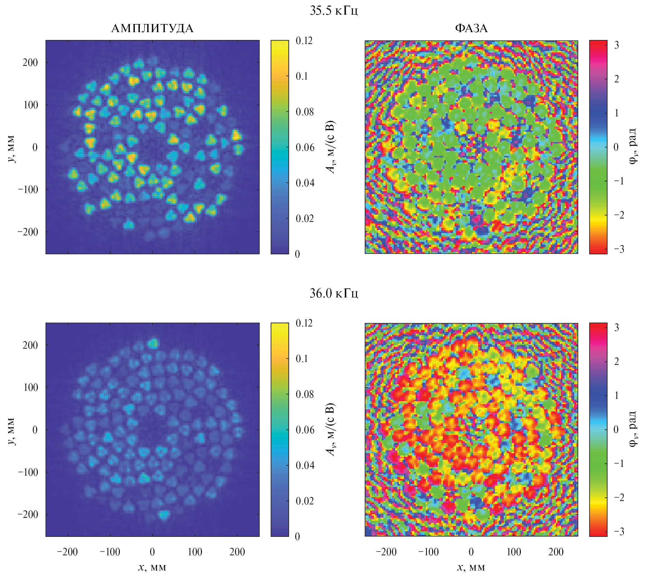 Рассчитанные из измеренной голограммы распределения амплитуды Aν и фазы φν нормальной компоненты колебательной скорости на сферической поверхности решетки представлены на рис. 5 на рабочей частоте решетки 35.5 кГц и на близкой к ней частоте 36 кГц. Полученные картины отчетливо показывают расположенные вдоль спиралей элементы антенной решетки. Из распределения амплитуды видно, что часть элементов решетки колеблется с малой относительно большинства элементов решетки амплитудой, однако большая часть, около 70% элементов, работает оптимально. По распределению фазы виден результат проведенной фазировки элементов: большинство элементов излучает в фазе. Малая амплитуда неэффективных элементов связана с отличием резонансной частоты этих элементов от выбранной рабочей частоты решетки. На рис. 5 представлено аналогичное амплитудное распределение Aν на частоте 36 кГц, из которого видно, что все элементы излучают более однородно, но менее эффективно. Фазовое распределение φν на частоте 36 кГц иллюстрирует, что на этой частоте фазировка элементов уже не является оптимальной.