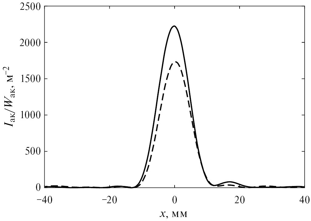 Рис. 6. Распределение интенсивности Iак акустического излучения, нормированное на полную акустическую мощность Wак излучения, на оси x в фокальной плоскости на частотах 35.5 кГц (сплошная линия) и 36 кГц (штриховая линия)
