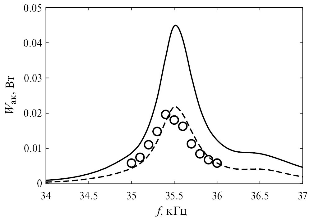 На рис. 7 представлены результаты измерения частотной зависимости акустической мощности Wак при амплитуде электрического напряжения на элементах излучателя U0 =1 В. Сплошной линией показана акустическая мощность, рассчитанная для такого напряжения из полной голограммы (размером 400×400 мм). Как видно, максимальное значение достигается на выбранной рабочей частоте 35.5 кГц и составляет примерно 0.045 Вт. Точками на рис. 7 показаны результаты измерения акустической мощности на основе измерения радиационной силы. Эти измерения показывают примерно в 2 раза меньшую акустическую мощность, что естественно, поскольку рефлектором захватывается лишь часть ультразвукового пучка. Штриховой линией показана рассчитанная из голограммы акустическая мощность, проходящая через круг диаметром 180 мм, что примерно совпадает с диаметром основания акустического рефлектора (210 мм). Некоторое уменьшение эффективного диаметра может быть объяснено тем, что на краю рефлектора приближение геометрической акустики нарушается из-за дифракции, и поэтому краевая область рефлектора не дает полного вклада в результирующую радиационную силу. Таким образом, метод акустического радиометра подтвердил корректность калибровки микрофона и правильность микрофонных измерений абсолютных величин акустического давления.