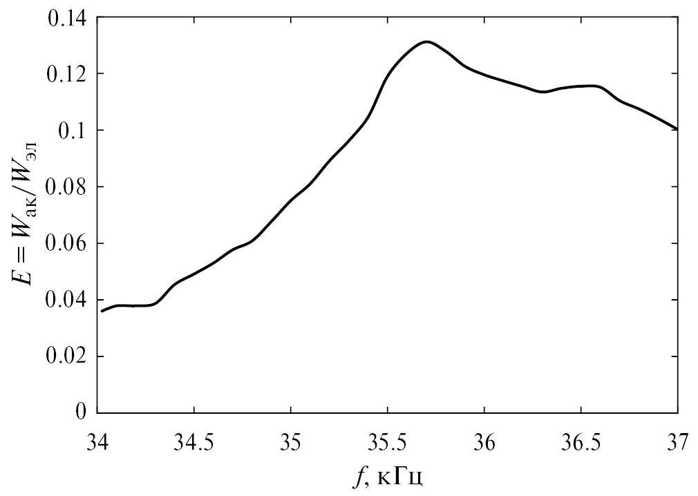 Одной из важных характеристик любого электроакустического преобразователя является эффективность преобразования электрической энергии в акустическую. Поскольку метод акустической голографии позволяет измерить полную акустическую мощность, а измерение электрического импеданса излучателя и напряжения на нем позволяет найти электрическую мощность, то комбинация указанных измерений позволяет рассчитать эффективность. На рис. 8 представлены результаты нахождения электроакустической эффективности E разработанной решетки в зависимости от частоты. Измерения показали, что максимальное значение эффективности решетки достигается на частоте 35.7 кГц и составляет порядка 13%. Эффективность на выбранной рабочей частоте 35.5 кГц примерно такая же (12%).