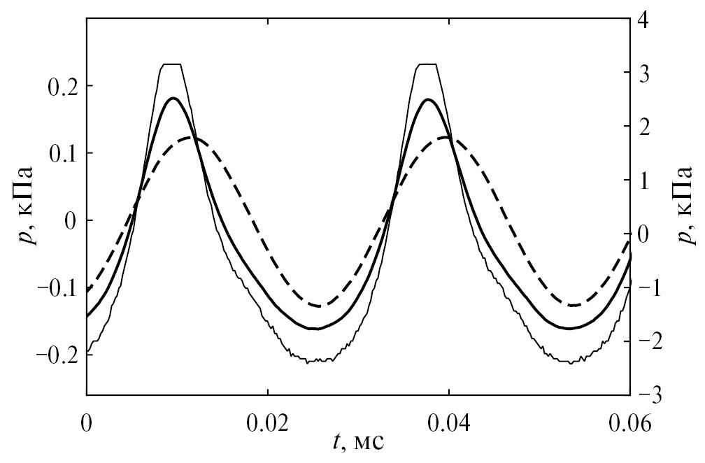 Рис. 9. Профили акустического давления в фокусе, измеренные при разных уровнях возбуждения элементов. Штриховая линия – профиль в линейном режиме при амплитуде электрического напряжения 0.5 В на элементах (шкала давления – слева). Сплошные линии – профили в нелинейном режиме; толстая линия – при амплитуде напряжения 5.8 В, тонкая линия при 7.7 В (шкала давления – справа)