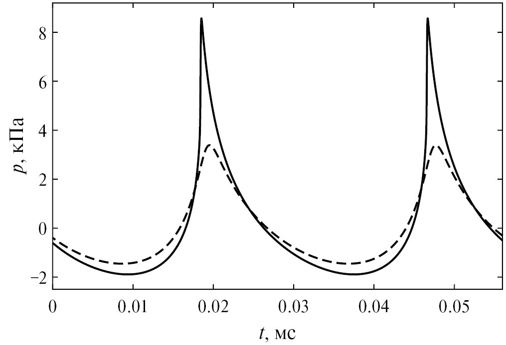 Рис. 10. Профили акустической волны в фокусе, полученные с помощью численного моделирования с использованием комплекса «HIFU beam» при амплитуде напряжения на излучателе 7 В (штриховая линия) и 10 В (сплошная линия)
