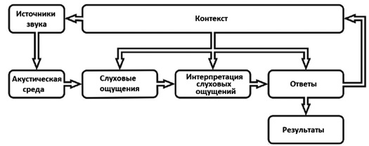 “Контекст” устанавливает связь между человеком и его деятельностью, местом и временем, он может влиять на восприятие звукового ландшафта через “слуховые ощущения”, через “интерпретацию слуховых ощущений”, через “ответы” и реакции человека на звуковую среду. “Слуховые ощущения” учитывают восприятие акустической среды человеком. “Интерпретация слуховых ощущений” – это переживания и ожидания человека, с учетом намерений и причин пребывания в заданном месте. Реакция человека на звуковую среду зависят от эмоционального, психологического, физиологического состояния, способностей контролировать себя под воздействием звуков, времени суток и условий освещения, личной деятельности и деятельности других. “Результаты” представляют собой долгосрочное последствие, обусловленное звуковой средой (например, человек принимает решение посещать или избегать какое-либо место).