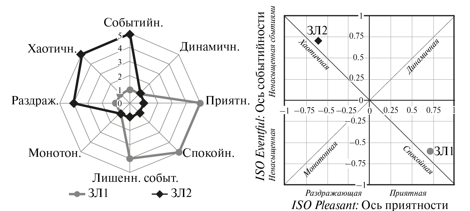 На рис. 2б представлено отображение 8 атрибутов звуковых ландшафтов ЗЛ1 и ЗЛ2 (рис. 2а) точками на плоскости “Приятность-Событийность”. Значения координат ISOPl и ISOEv меняются в диапазоне от -1 до +1. Четыре квадранта на плоскости характеризуют звуковые ландшафты как “оживленный – хаотичный – скучный – спокойный”. “Оживленный” или “яркий, динамичный” звуковой ландшафт аттестуется одновременно как приятный и насыщенный событиями; “хаотичный”– как неприятный и насыщенный событиями, “скучный” или “монотонный” звуковой ландшафт – как неприятный и лишенный событий, а “спокойный” – как приятный и ненасыщенный событиями. По расположению точек (рис. 2б) звуковой ландшафт ЗЛ1 можно описать как очень неприятный, хаотичный и насыщенный событиями, а ландшафт ЗЛ2 – как очень приятный, спокойный и лишенный событий. Таким образом, по значениям координат ISOPl и ISOEv точек на плоскости “Приятность-Событийность” (рис. 2б) стандартный метод А позволяет определить, насколько звуковой ландшафт был приятным и насыщенным событиями. Принято, что координата ISOPl отражает то, насколько среда была для субъекта приятной (т.е. свойства субъекта), а координата ISOEv – насколько среда была событийной (т.е. свойства среды).