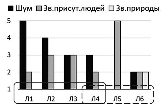 В разных локациях эксперты выявили разные типы звуков (рис. 4). В локациях Л1-Л4 вблизи университета имели место звуки двух типов: “Шум” и “Звуки присутствия людей” (рис. 4). Основным источником “Шумов” в Л1 был движущийся автотранспорт, а в Л2 и Л3 – движущийся автотранспорт и строительные работы. Высокие ранги “Шумов” и их превалирование над рангами “Звуков присутствия людей” в Л1 и Л2 явно указывали на раздражающий характер звуковых ландшафтов. Во время проведения экспертизы “Звуки присутствия людей” в Л4 превалировали над “Шумами”. На пешеходной улице Л5 эксперты указали только на высоко ранговые “Звуки присутствия людей”, а во дворе жилого дома (Л6) – на низко ранговые звуки трех типов.