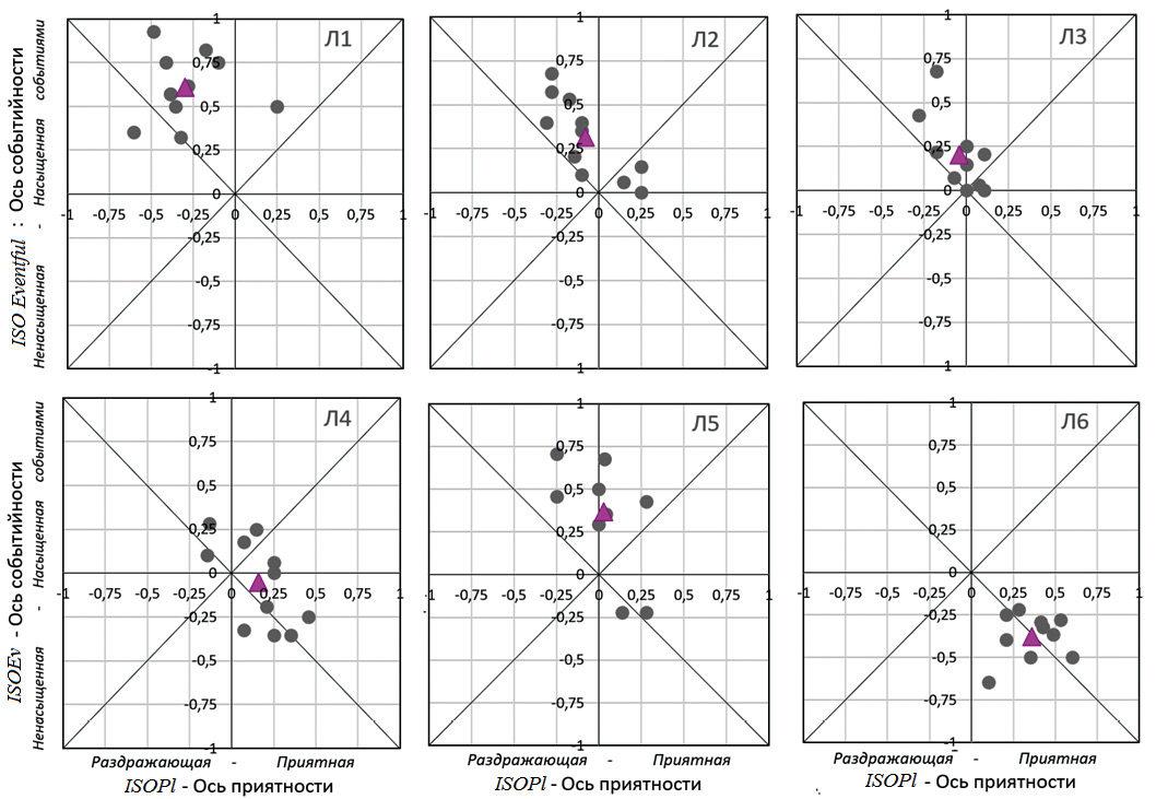 На рис. 5 отображены индивидуальные и средние оценки звуковых ландшафтов точками на плоскости “Приятность-Событийность” с координатами ISOPl и ISOEv. В первой группе локаций и по положению средней оценки самым неприятным, хаотичным и насыщенным событиями был звуковой ландшафт локации Л1, которая непосредственно примыкала к оживленной транспортной магистрали. Локация Л2 располагалась в уютном сквере и традиционно считалась приятной, однако, в день экспертизы звуковой ландшафт оказался неприятным и насыщенным событиями из-за громких звуков проводимых рядом строительных работ и яркого освящения строительной площадки. Локация Л3 находилась перед входом в общежитие, ее звуковой ландшафт нейтральный по приятности, но насыщенный событиями. В локации Л4 экспертизу проводили на ступенях монументального здания нового Главного корпуса, перед которым была парковка, которая отделяла локацию от оживленной транспортной магистрали. Во время экспертизы локации имело место приятное приглушенное освещение заходящим за горизонт солнцем. По положению координат ISOPl и ISOEv звуковой ландшафт в Л4 по сравнению с Л1-Л3 был наиболее приятным и менее всего насыщенным событиями (рис. 5).