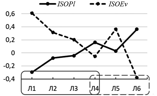 Средние значения координат ISOPl и ISOEv, характеризующие звуковые ландшафты в 6 локациях, представлены на рис. 6. В первой группе локаций Л1-Л4 изменения координат обусловлены снижением рангов неприятных звуков типа “Шум” (рис. 4): значения ISOPl повышались от отрицательных до положительных значений, а значения ISOEv снижались от высоких положительных значений почти до нуля. Во второй группе выделялась локация Л5. Здесь доминирующим типом был “Звук присутствия людей” (рис. 4). Поэтому оценка ISOPl была несколько ниже, а оценка ISOEv – значительно выше таковых в Л4 и Л6.