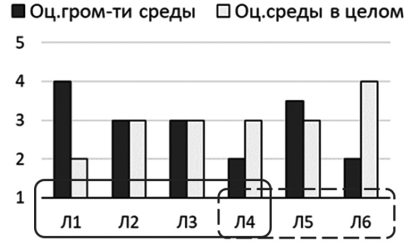 Эксперты с разной частотой посещали локации Л1-Л6: очень часто посещали локацию Л1, часто – локации Л3 и Л5, нечасто – локации Л2 и Л5, совсем нет – локацию Л6. Ранги оценок соответствия среды месту варьировали между “нейтральной” и “хорошей” (ранги 3-4). Оценки желания посещать локации в будущем варьировали около “не часто, при случае” (оценка 2-3). Последние оценки, по-видимому, отражали лояльность экспертов к учебному заведению и учитывали срок обучения.