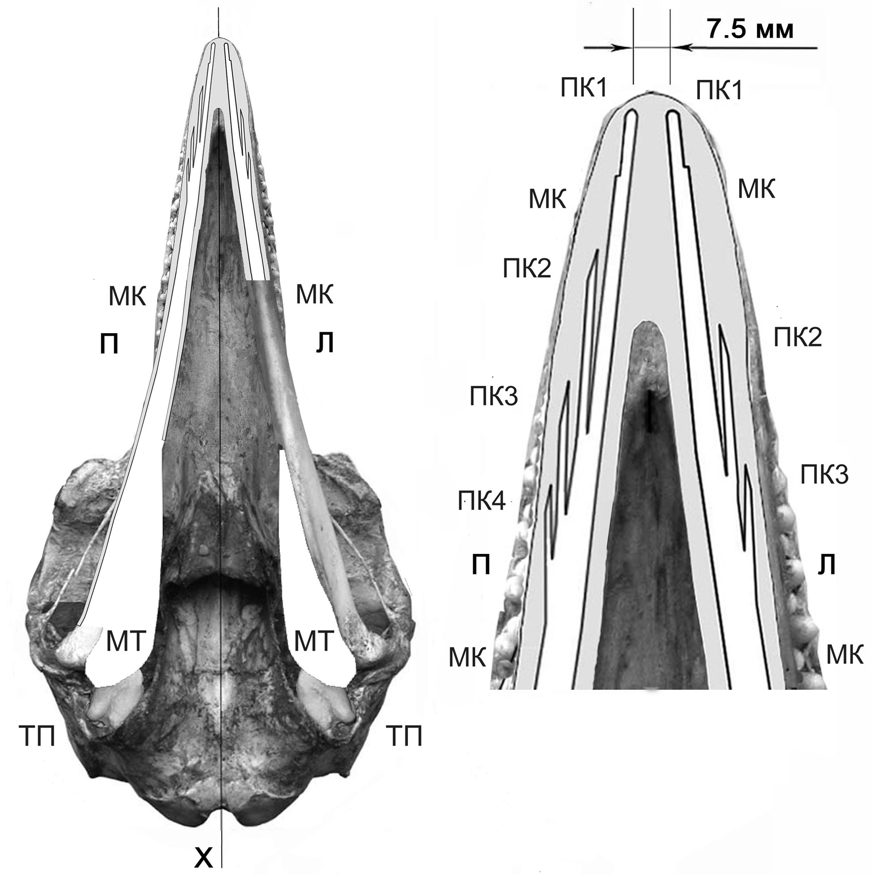 Материалом при изучении морфологии каналов нижней челюсти [6, 11, 13, 14] служили кости черепа и нижней челюсти четырех взрослых дельфинов вида афалина (Tursiops truncatus), которые мы нашли в разное время на берегу моря. Для изучения морфологии и выполнения необходимых измерений одна из нижних челюстей была распилена в области ПК. Далее в тексте будем обозначать их, если это необходимо, с номером ПКn, где n – номер канала, считая от кончика рострума; n = 1, 2, 3, 4. Измерение поперечных размеров каналов проводилось в плоскости максимальной ширины канала и во взаимно перпендикулярной плоскости.