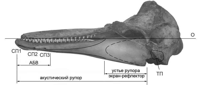 Рис. 2. Череп дельфина, латеральный вид, левая сторона. АБВ – антенна бегущей волны (ряд ПК1-ПК3, рис. 1.) СП1–СП3 – наружные слуховые проходы. Профиль СП1 – сплошная линия (профиль ПК1 и МК). Устье акустического рупора – каудальный раскрыв медиальной стенки кости нижней челюсти (штриховая линия). Акустически непрозрачный экран-рефлектор – наружная заднелатеральная стенка кости нижней челюсти. ТП – тимпанопериотический комплекс. О – продольная ось головы животного.