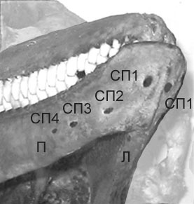 При взгляде на наружные уши дельфина (Tursiops truncatus) бросается в глаза, что в отличие от СП человека, расположенных симметрично по бокам головы головы, имеющей сферическую форму, левый и правый ряд СП дельфина максимально вынесены навстречу отраженным от подводных объектов эхо и звукам в направлении максимума точности их локализации (рис. 1–3). Более того, левый и правый ряд СП имеет билатеральную и рострально-каудальную асимметрию и размещены на острие рострума дельфинов рострально-вентрально, существенно ниже продольной оси рострума, О, т.е. асимметрично [12]. Вместе с тем ярко выраженную рострально-каудальную асимметрию имеют и череп, и нижняя челюсть дельфинов [12].