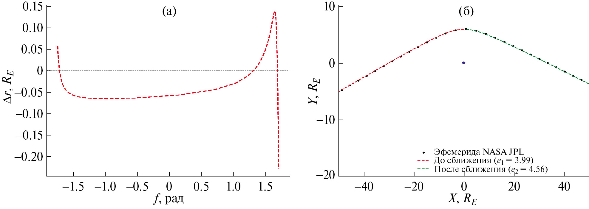 Рис. 2. Орбита Апофиса: (а) – расстояние Δr между орбитой Апофиса и ее проекцией на построенную нами плоскость (см. рис. 1) в зависимости от истинной аномалии f; (б) – аппроксимация орбиты Апофиса в окрестности Земли ветвями двух гипербол. На рисунке (б) синий кружок – Земля, точки – орбита Апофиса, красная и зеленая штриховые линии – ветви гипербол.